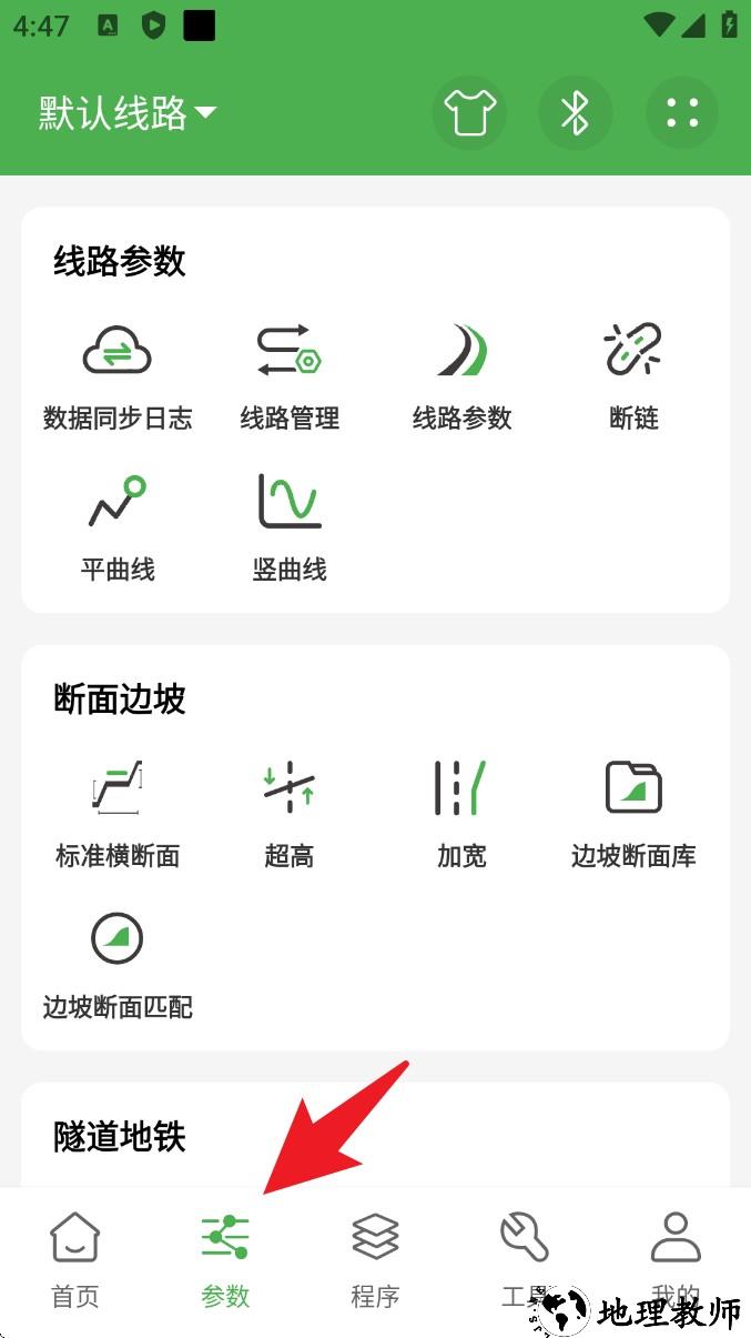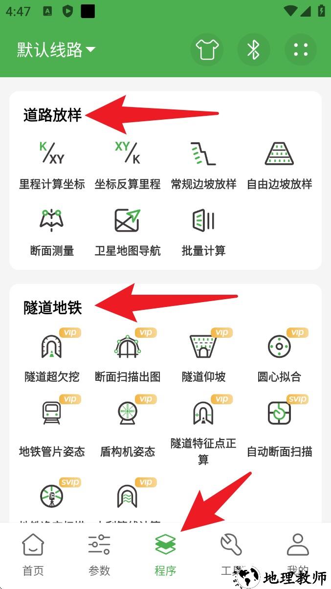 3. 进入程序页,可看到道路放样与隧道地铁模块,包括断面扫描、盾构姿态、自动断面扫描等功能入口。