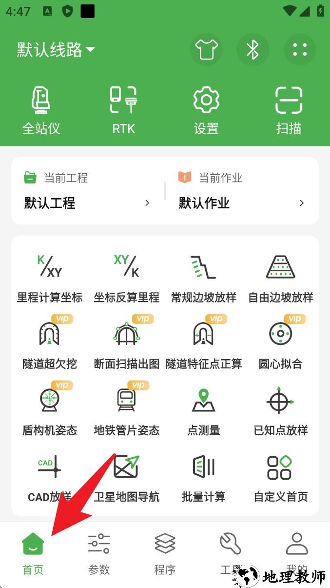 1. 进入首页后,可查看默认工程与默认作业,点击功能区可选择RTK、全站仪、设置或扫码等操作。