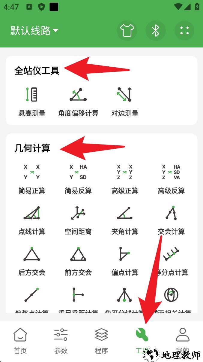 4. 点击工具页,可使用全站仪工具和几何计算,包括角度偏移计算、交会计算、空间距离等辅助测量功能。