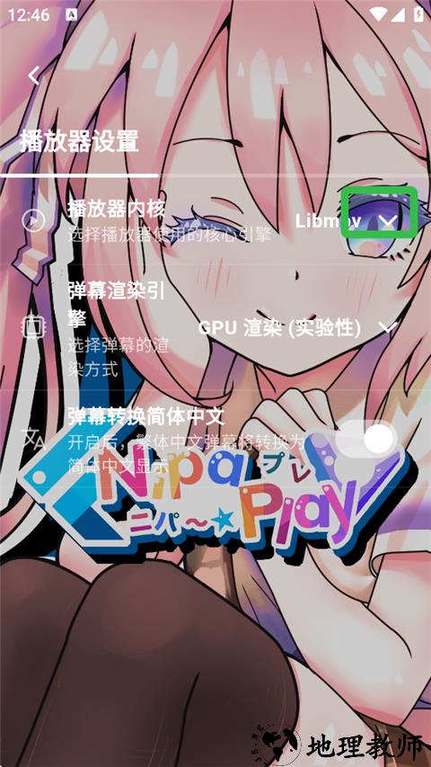 3、找到“播放器内核”一栏,点击其右侧的箭头,展开内核选择列表。