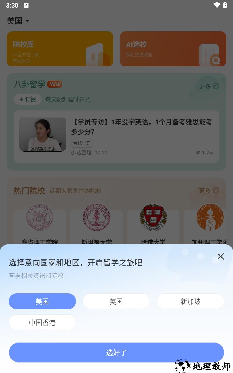 6、留学界面中,可按目标留学地点查看相关经验贴。
