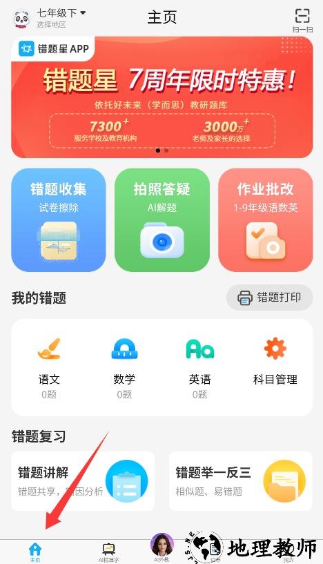 3、进入功能主页后,可体验错题管理、拍照解题和作业批改等学习辅助工具。