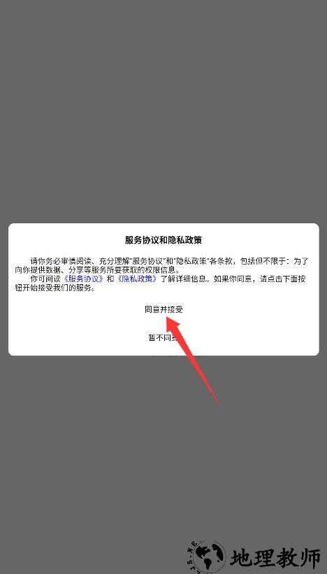 1、初次使用需完整阅读平台服务条款与隐私政策,确认后点击同意并接受进入应用。