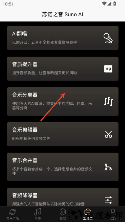 4、内置丰富音乐工具箱,涵盖ai翻唱、音质提升器、音乐分离器、音乐剪辑器等实用工具,满足多元创作需求。