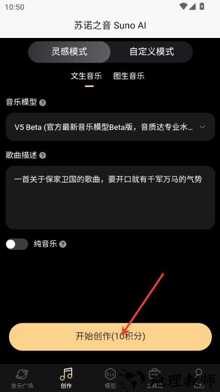 2、创作模块包含灵感模式和自定义模式,选择对应模式后,对歌曲风格、主题等进行描述,即可启动音乐创作。