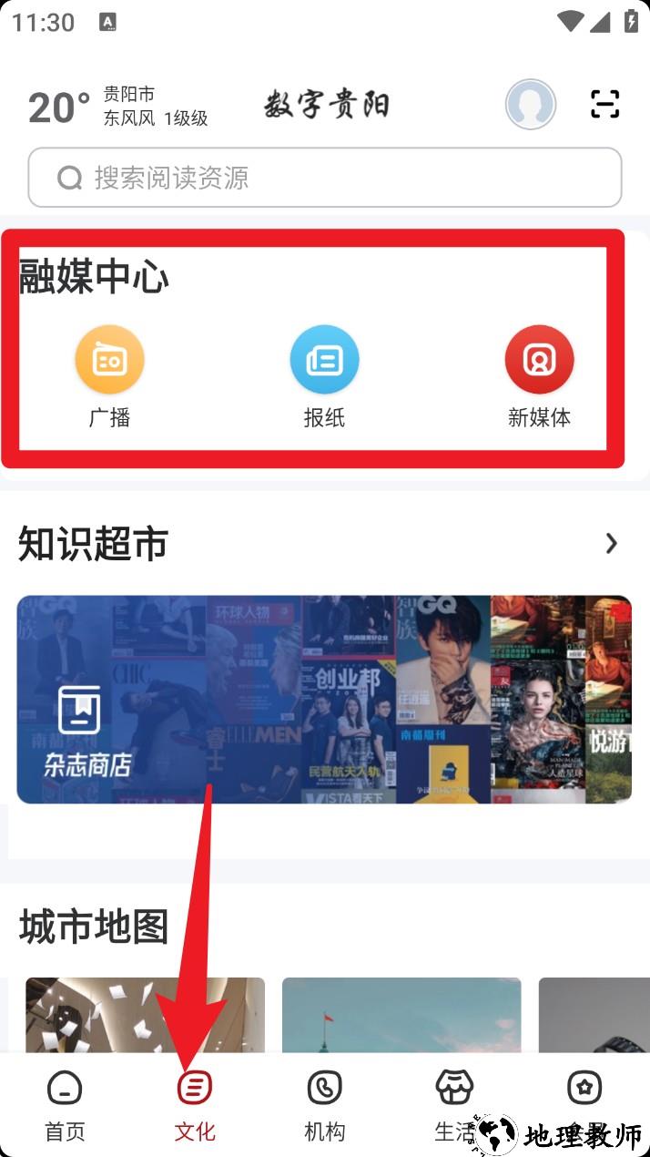 2. 点击下方导航栏的文化图标,可进入融媒中心、知识超市、城市地图等文化资源专区。