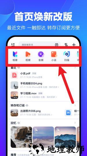2、在新版首页界面中,可通过顶部快捷入口快速访问相册、视频、音频、小说和扫描等常用模块。