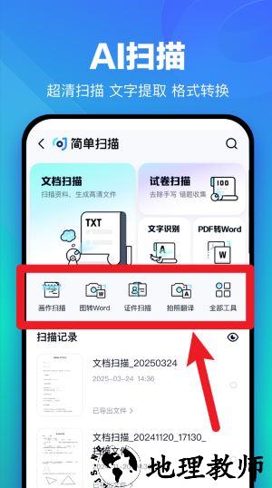 3、点击扫描功能进入后,提供图片扫描、文档转Word、证件扫描和拍照翻译等多项ai智能工具。