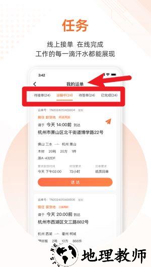 2、在我的运单页面中可查看待接单、运输中、待签单及已完成等不同阶段任务详情。
