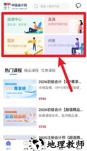 3、点击首页中的选课中心、直播、题库、问答等版块,快速进入对应学习与互动功能。