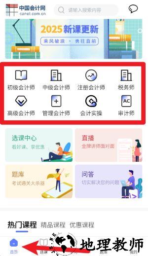2、进入首页后,可根据个人学习需求选择初级、中级、高级或注册会计等课程模块。
