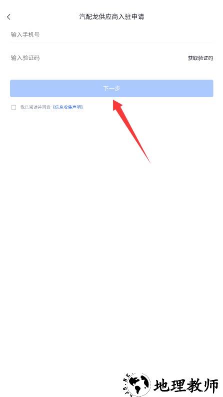 1、在入驻申请界面,输入手机号和验证码,勾选同意信息声明点击下一步登录进入。