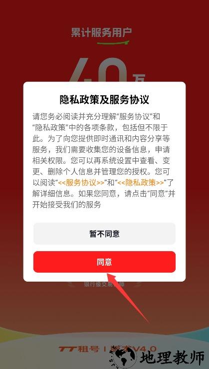 1、初次使用需完整阅读平台服务条款与隐私政策,确认后点击同意按钮进入应用。