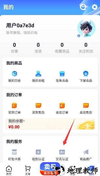 3、进入个人中心页面后,找到实名认证功能,按要求完成身份验证即可开通卖家权限。
