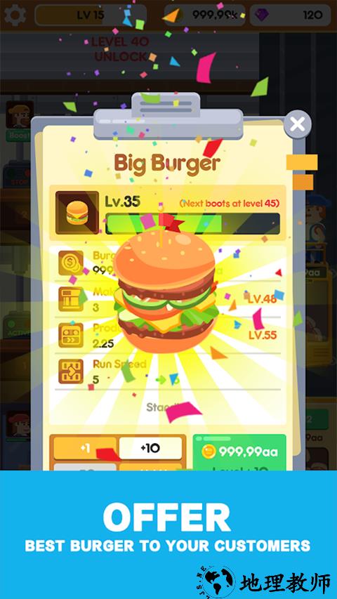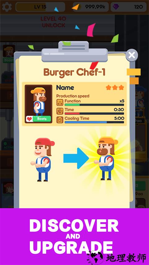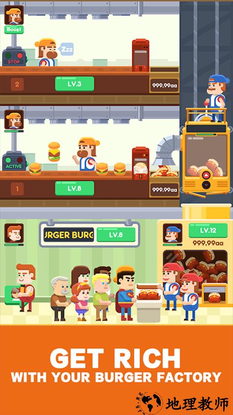 1. 核心玩法:玩家需管理汉堡生产全流程,包括原材料采购、设备升级(如烤肉机、切片机)、员工招募(厨师、物流员、收银员)及订单配送。通过完成订单获取金币,用于解锁新食材(如鹅肝、龙虾)和高级配方,提升工厂效率。