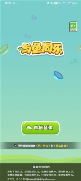 1、在本网站下载与鱼同乐赚钱红包版以后,勾选用户协议和隐私政策,点选【微信登录】进入。
