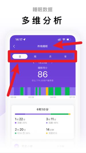 2、在多维分析界面中,可通过日、周、月、年查看详细睡眠数据,并了解每晚睡眠得分及各阶段比例。