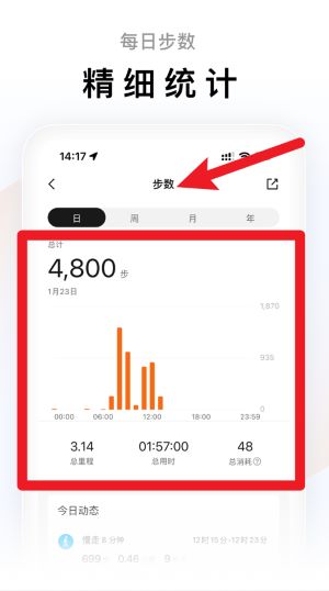 4、每日步数统计页面提供步数变化柱状图,并同步展示总距离、用时及卡路里消耗,便于掌握当天活动情况。