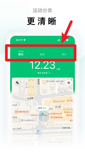 3、运动分类页面支持选择健走、跑步、骑行模式,系统将根据选择自动记录运动轨迹与距离并呈现地图定位。