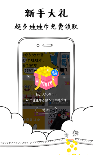 1、新手大礼:新用户使用应用即可领取娃娃币大礼包,深度体验在线抓娃娃的畅快感~