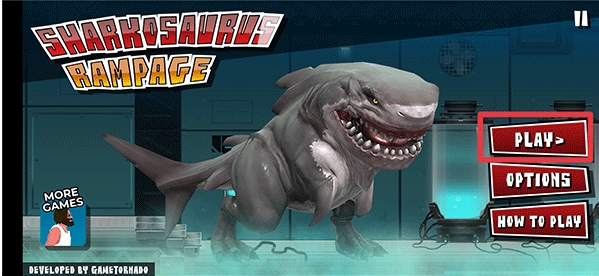 2、游戏开始后,首先点击右下角按钮操控鲨鱼咬碎开关,让自己能够逃离水箱,