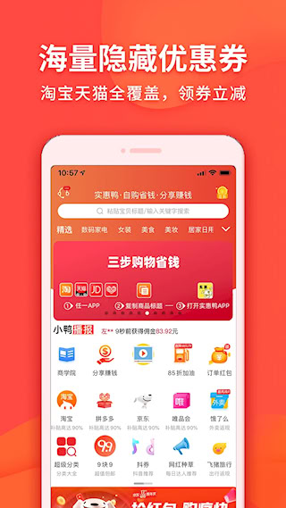 1、 海量优惠券:提供海量淘宝京东拼多多等平台的优惠券,涵盖各类商品,购物时可随意领取,省钱购物。