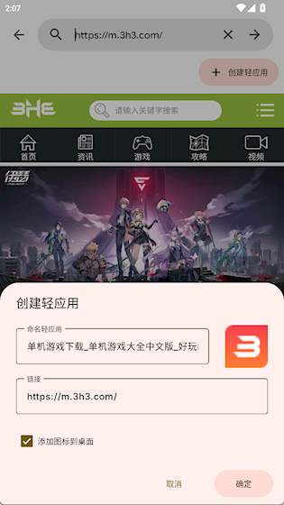 3、输入网址,点击创建轻应用,点击确定
