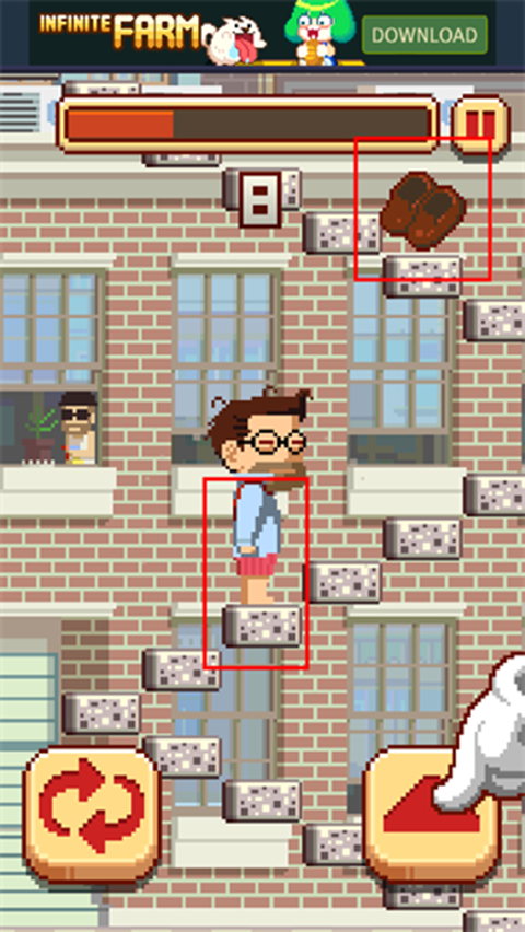 Infinite Staircase是一款像素风休闲动作游戏,需要操控角色不断向上攀登无尽的阶梯,画面色彩鲜艳充满活力,操作简单,点击屏幕左右两侧来控制角色移动,在规定时间内尽可能爬得更高,会遇到各种障碍物和陷阱,需要快速反应和精准操作。