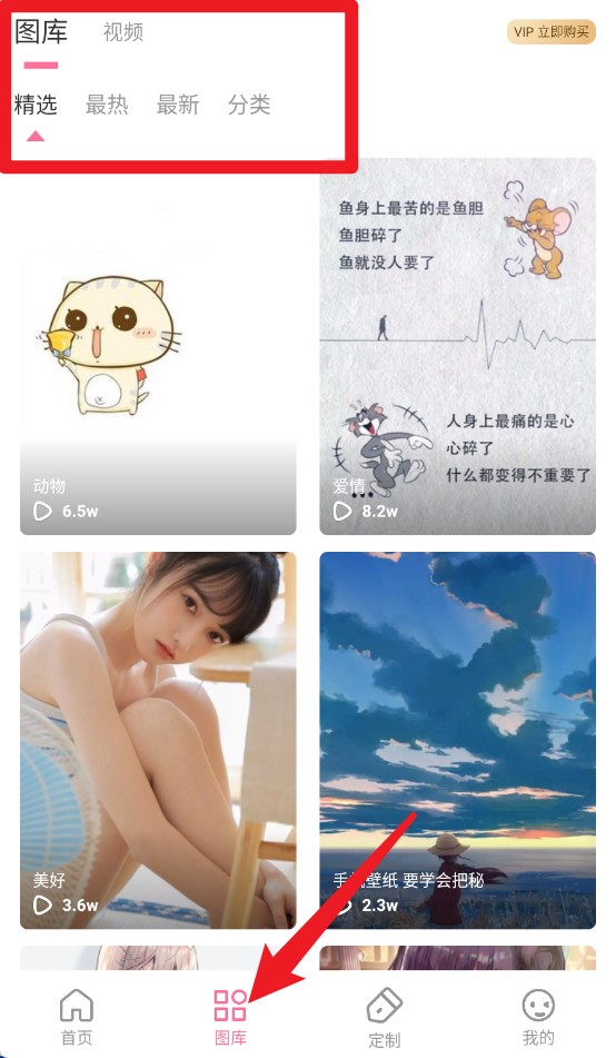 3、图库页面分为精选图片与视频两大分类,支持按最热、最新等标签筛选,浏览操作便捷。
