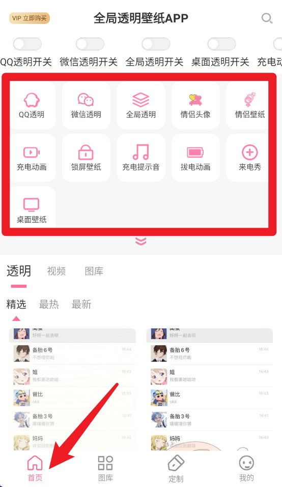 1、首页可快速开启Q透明、微信透明、全局透明等功能,点击对应图标即可进入设置界面。