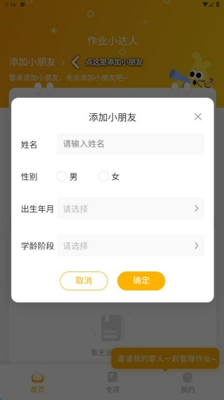 4、确认小朋友信息后,按学科添加每日作业,实现分类管理,避免遗漏。