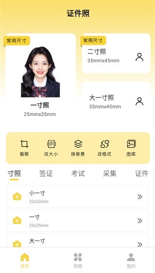 1、软件提供多种证件照制作规格尺寸,包含一寸、二寸等常用类型,可制作不同类型证件照。