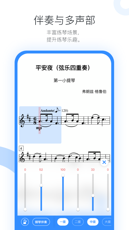 丰富练琴场景:提供了多种练习场景,包括独奏练习、协奏练习、视奏练习等,满足用户不同的练习需求。