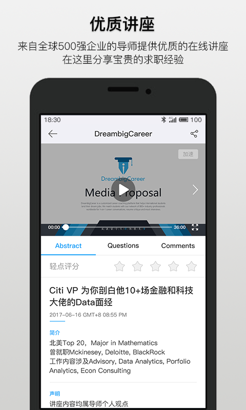 线上集训:DBC是首个开办线上商学院的求职平台,内容包括投行/四大网申集训,部门科普直播课堂,加强导师学员线上互动,促进学员间相互监督,相互分享学习资源