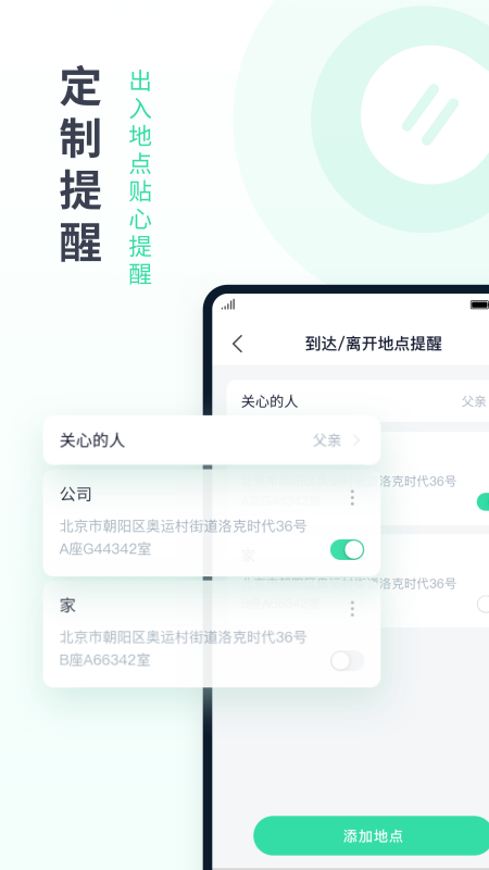3、出入提醒,为家人朋友设置出入地点提醒,当对方到达或离开某个地点,你都将收到提醒;