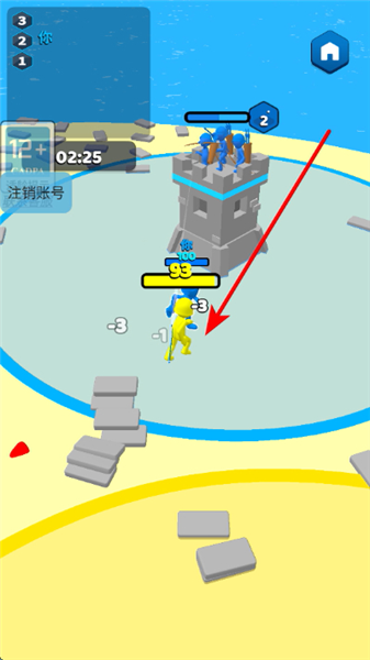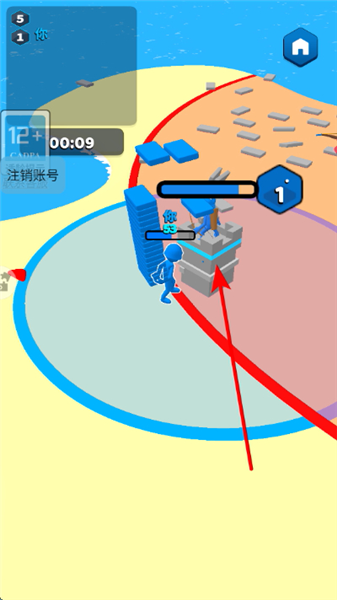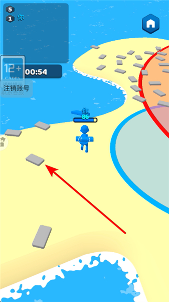 1、玩家沙滩移动,拾取散落的砖块资源,积累足够的材料后,用于搭建或升级己方的城堡建筑。