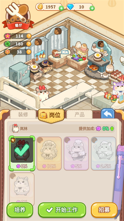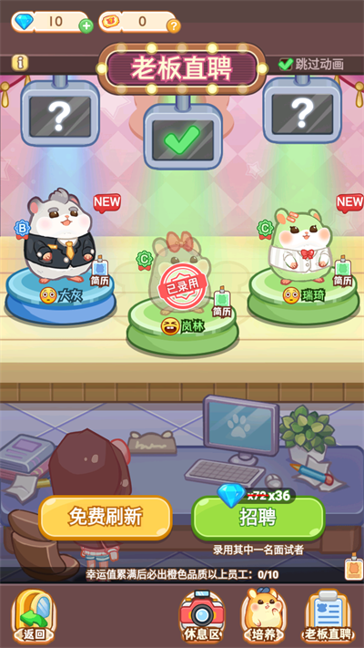 1、 员工招募管理:通过扭蛋等方式获取仓鼠员工,依据其特长分配岗位,并通过培训提升服务效率与技能水平。