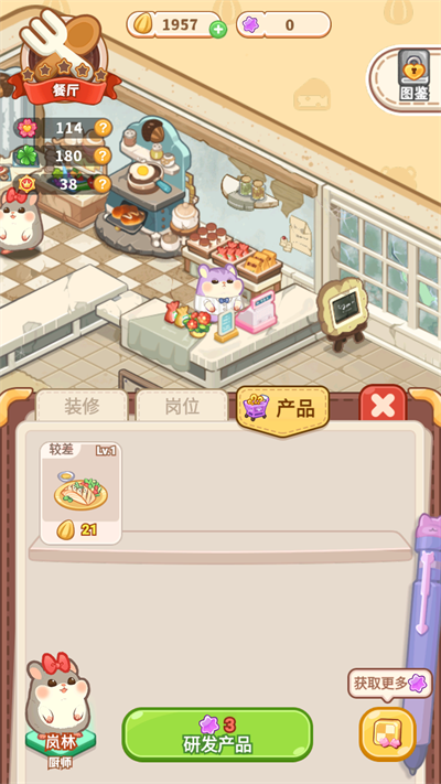 3、 产品研发系统:参与小游戏积累研发点,用于开发新商品或升级现有产品,丰富菜单以满足多样化需求。