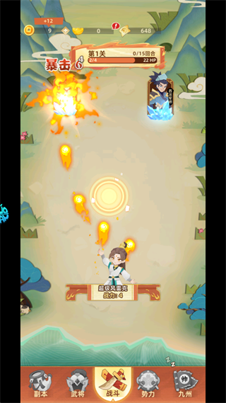 1、游戏玩法为点击屏幕消灭敌人闯关为主,点击作为前期主要伤害来源稍显费力,后期可以通过武将组合实现自动化闯关。