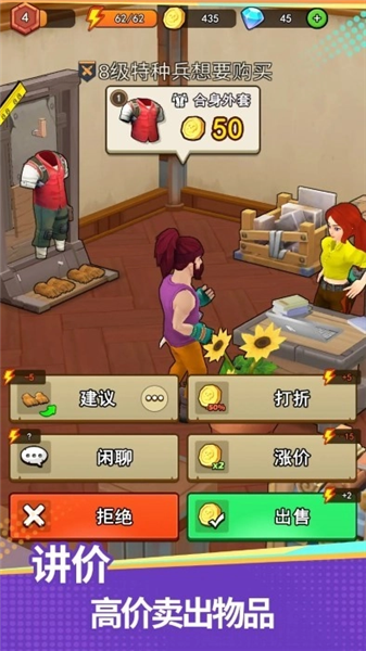 3、交易拍卖行玩法:制作的稀有装备可上架拍卖行,与其他玩家交易赚取钻石。经营赚钱不止依靠商店,可在交易市场中尝试高买高卖,灵活操作,成为交易市场的核心玩家。