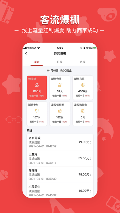 流量、交易、会员行为、活动效果、成本分析等核心数据一手掌握,帮助您高效经营店铺。