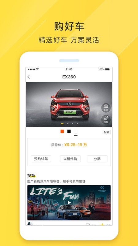 选车:按品牌、价格、车型等搜索想要的新能源汽车。在线对比车辆详细配置参数,在线与客服实时聊天咨询购车详情等。
