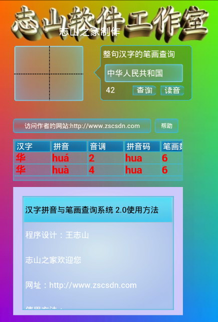 笔画查询、声调等。4、当输入一行汉字时可以查询出整行汉的笔画总数;5、当查询到汉字后,可以读出汉字正确的读音,发出读音时,无需联网无。软件有效