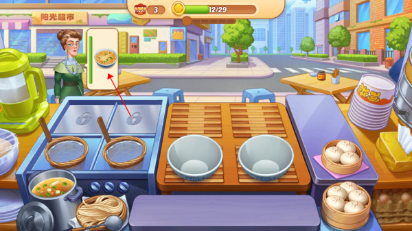 2、注意火候,当食材制作完成时,点击食材捞出,再点击食品即可给有需求的顾客