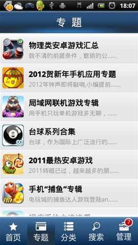 在酷软汇客户端中,丰富的资源按照功能类别进行了细致的归类显示,更清晰快捷,方便用户查找和下载,有效节省时间;各种丰富的专题,可以为各种不同需求的用户带来较适合的Android应用集合。