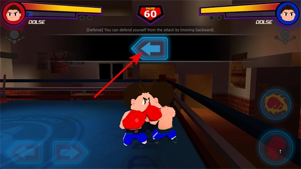 4、点击左方向按钮可向后移动躲避攻击,这是防御的关键操作,躲避时需要在对手攻击前及时点击以减少损伤。