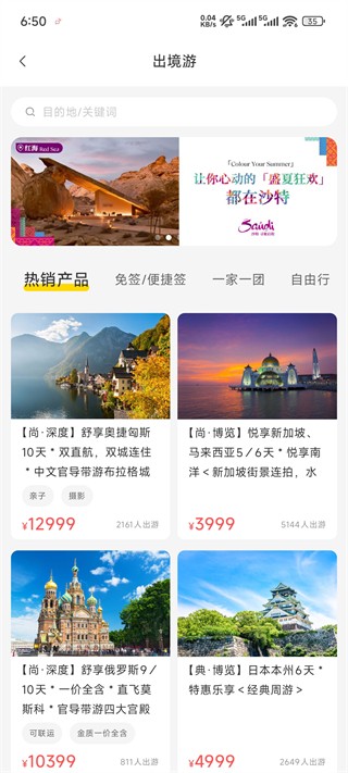 2、可在搜索栏输入目的地检索相关产品,也可直接选择软件内热销旅游产品。