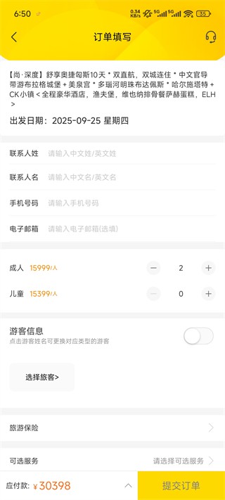 4、最后准确填写游客相关信息,确认无误后点击“去付款”,即可完成预订。