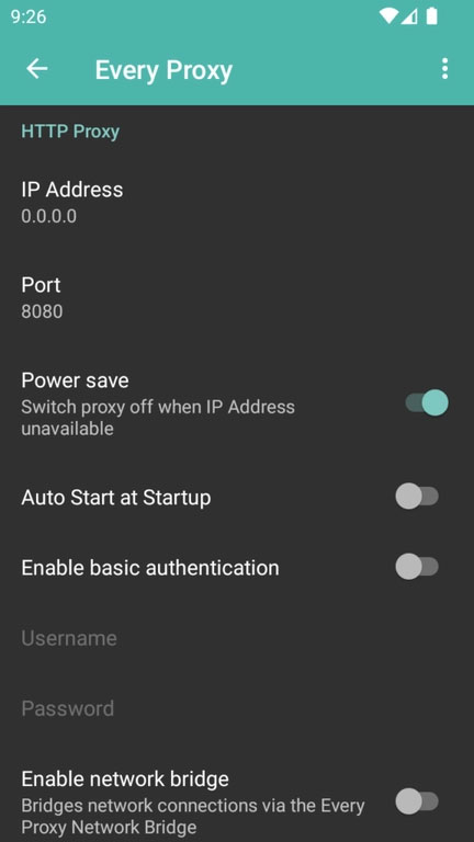 注意:当代理与某个特定IP地址绑定时,如果设备因开启省电功能或网络变化而丢失该IP地址的分配,代理服务会自动关闭,以节省电池电量。待设备重新获取到该IP地址后,用户需要手动重启代理服务器,方可继续使用。