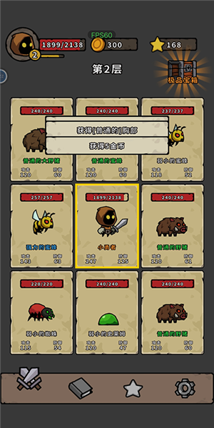 1.闯关冒险玩法,步步推进挑战怪兽,通关过程中自由收集各类装备道具。